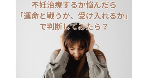 こんにちは。子なし妻のすーです。毎日、生産性なく過ごしています(・∀・) 先日、ちきりんの「ゆるく考えよう」という本を読みました。 その中に「運命と戦うか受け入れるか」という章があり、これってまさに不妊治療をするかしないかの判断基準に適した考…