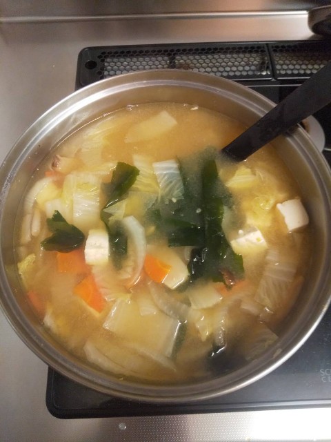 味噌汁に白菜、玉ねぎ、人参、きのこミックス、お豆腐、わかめが入っています。