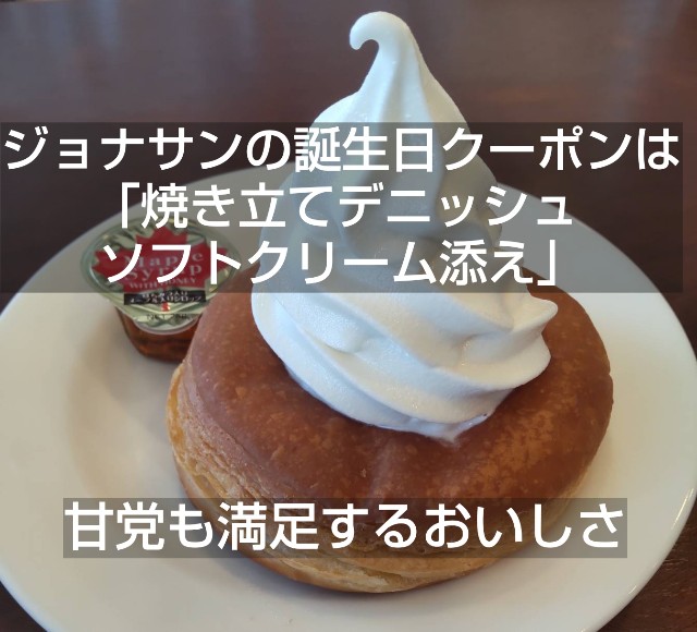 ・2023年8月時点のジョナサンの誕生日クーポンは「焼きたてデニッシュ ソフトクリーム添え」が494円→109円になる